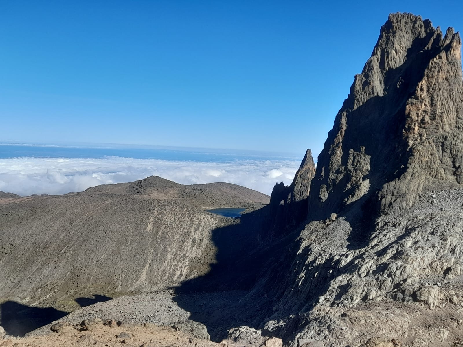 Pre-dawn (3.00am) hike up to the point Lenana starts. Steep, snowy, slippery and wet all the way for three hours to get to the top at sunrise. Enjoy the morning light as it emerges from the eastern horizon.